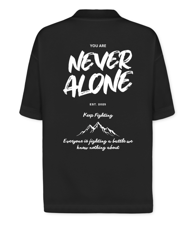Vista a força de nunca desistir. A Zayon Never Alone carrega atitude e propósito em cada costura — feita com malha Suedine 230g/m², garante conforto premium, caimento oversized e presença marcante. Porque quem veste Zayon sabe: você nunca tá sozinho na caminhada. ⚡